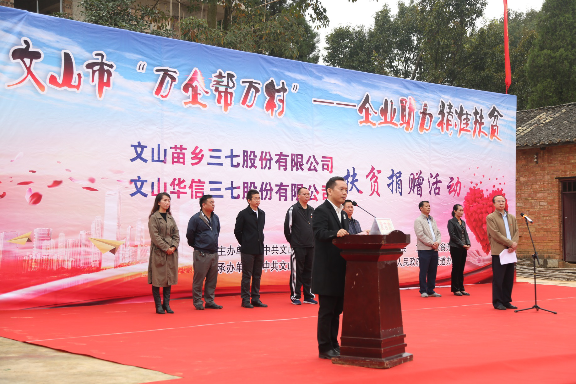 2017年11月18日,苗鄉(xiāng)三七董事長余育啟、副總經理田藝、董事長助理熊婷等代表苗鄉(xiāng)三七積極參與了文山市民營企業(yè)“萬企幫萬村”——精準扶貧活動